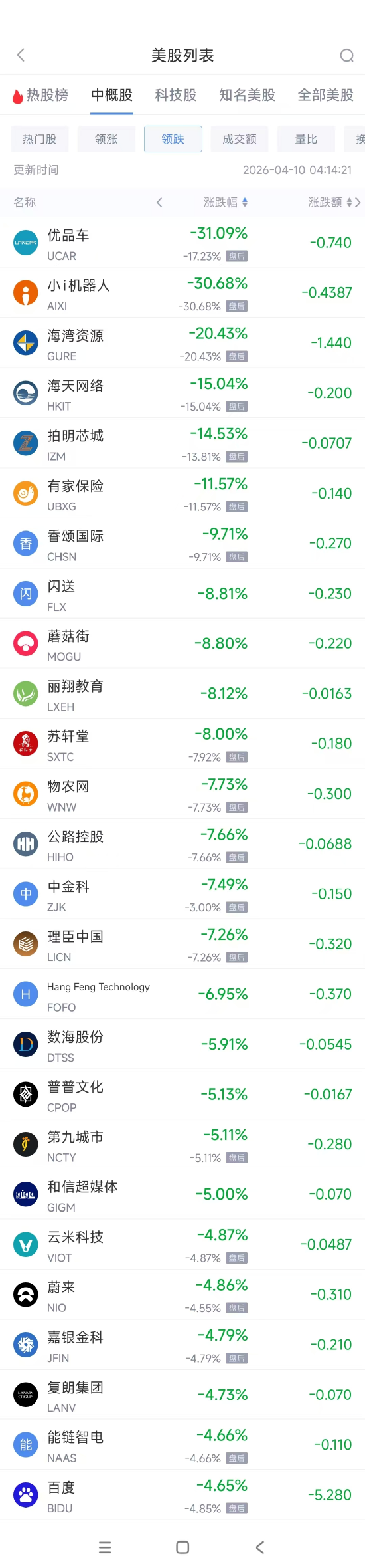 领跌中概股列表: