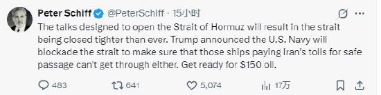 在特朗普宣布将封锁霍尔木兹海峡后,美国知名经济学家彼得·希夫警告称,原油价格在未来几天可能达到每桶 150 美元。