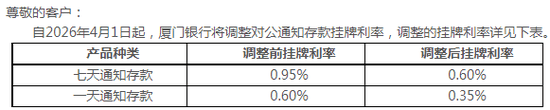 与此同时,厦门银行还调整了部分零售存款产品的挂牌利率。3月31日,该行发布公告称,自4月1日起,一天通知存款由0.65%降至0.60%;七天通知存款由0.95%降至0.90%,均分别下调5个基点。