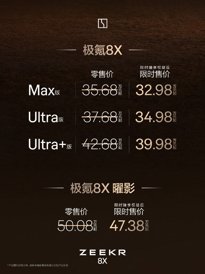 凤凰网科技讯 4月17日,极氪旗下旗舰电混SUV――极氪8X正式上市。官方指导价35.68万元起,叠加首发权益后售价32.98万元起。新车提供Max、Ultra、Ultra+、曜影四款版本,其中曜影版首发权益价47.38万元。
