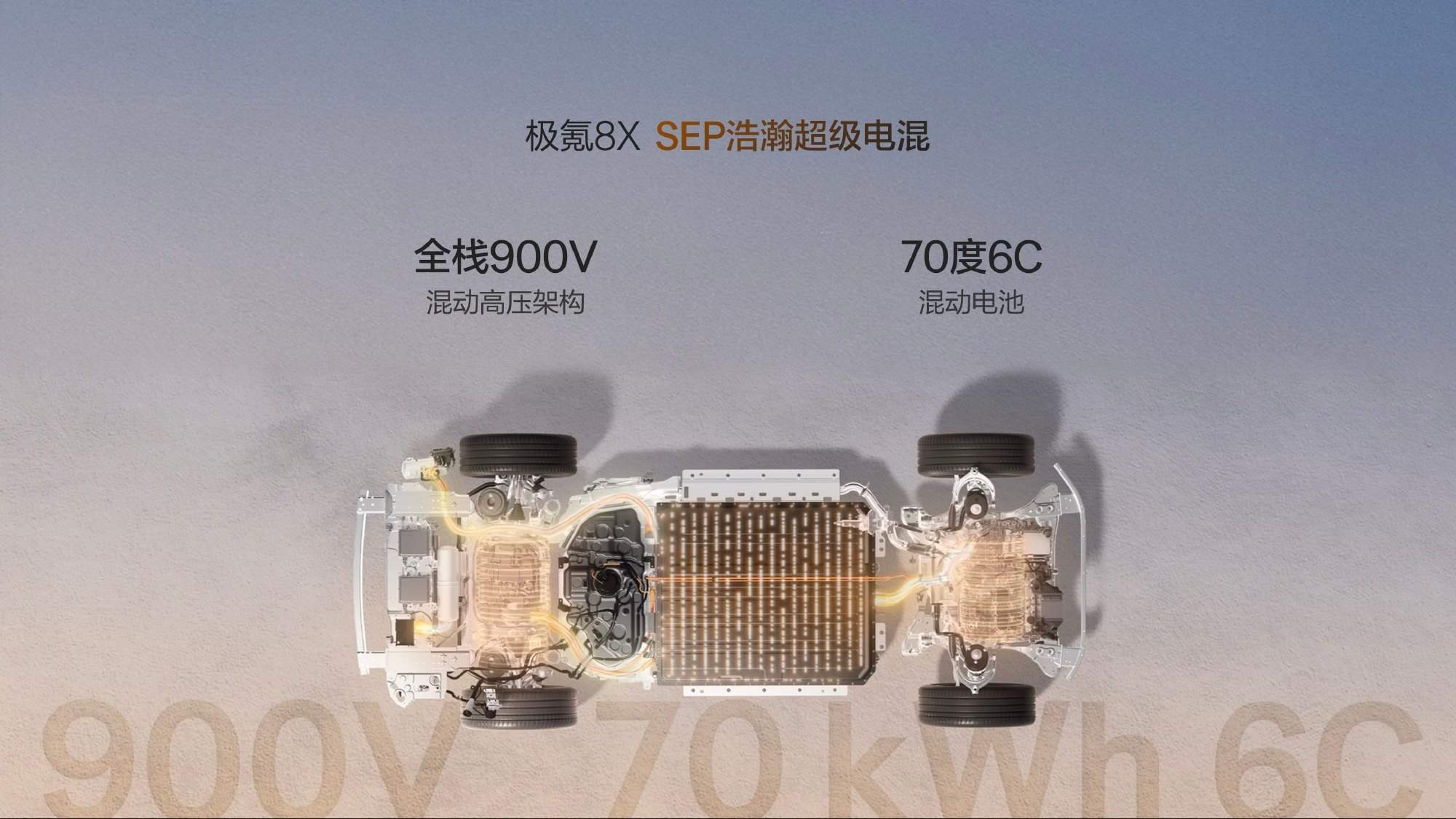 极氪8X基于浩瀚-S超级电混架构打造,全栈900V高压平台。动力上搭载混动领域首个三电机兆瓦电驱,峰值功率1030kW,马力超1400PS;配备同级更高功率145kW增程发电机及2.0T超级电混专用发动机(205kW)。三电机版零百加速仅2.96秒,双电机版3.7秒。