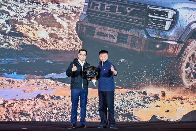 左一:奇瑞RE *** 威麟皮卡事业部总经理张佳明。右一:奇瑞赛车队队长陶鹏飞