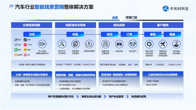 当前,汽车行业普遍面临线索量激增但转化率走低的双重压力。传统外呼模式下,坐席规模受限、人员波动大、执行标准不一等问题,使得大量线索因未能及时跟进或清洗不彻底而白白流失。中关村(000931)科金在本次训练营中,基于一线本土车企与合资厂商的真实业务场景,系统展示了从社媒线索洞察到线索清洗与培育,从到店成单到客户服务的智能线索全链路营销解决方案,帮助车企提升有效线索产出与商机转化效率。