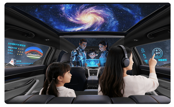此次发布的“全车透明交互式显示方案”构建了完整的“三屏一显”产品矩阵,为用户带来前所未有的座舱体验。天窗透明显示大屏、后排隔断透明触控大屏与侧窗透明触控大屏合而为一,在保持玻璃原有通透视野的同时,将整个车窗转化为超大尺寸的显示界面,为后排乘客打造沉浸式透明交互式乘娱新空间。基于自主研发的“nanoAR™ 光子透明显示技术”,实像型透明显示实现了超过85%的高透明度,仅需100流明投影机即可在阳光下清晰显示,完全符合汽车玻璃安全标准。