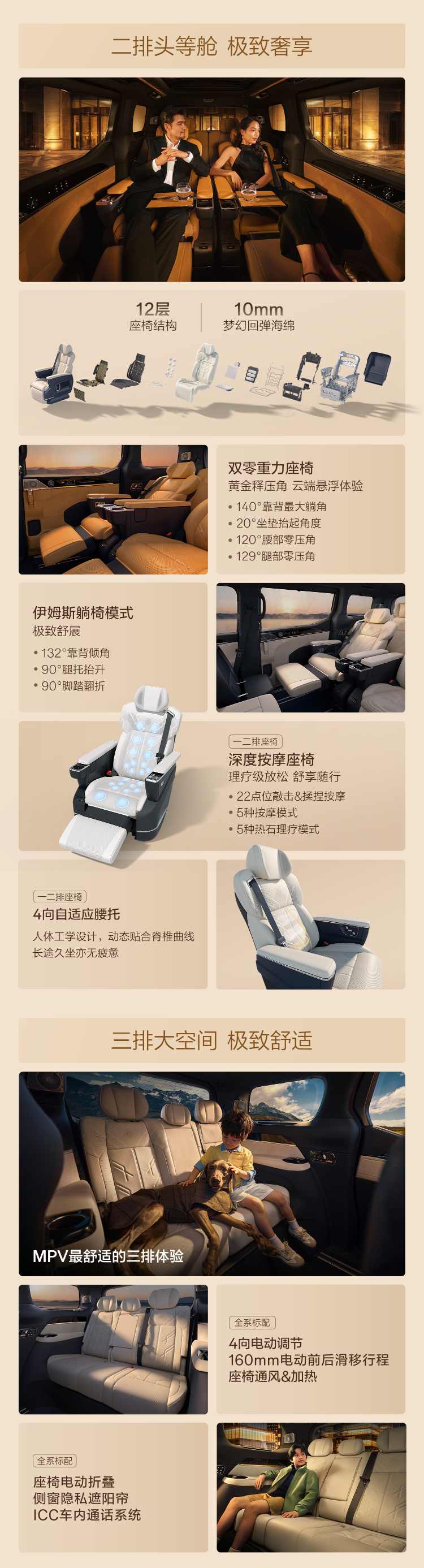座舱层面,六座行政版配备Sofaro头等舱航空座椅及双零重力座椅,支持140°靠背躺角,行业首创伊姆斯躺椅模式(132°靠背+90°腿托+90°脚踏)。二排提供22点位 *** 、5种热石理疗。