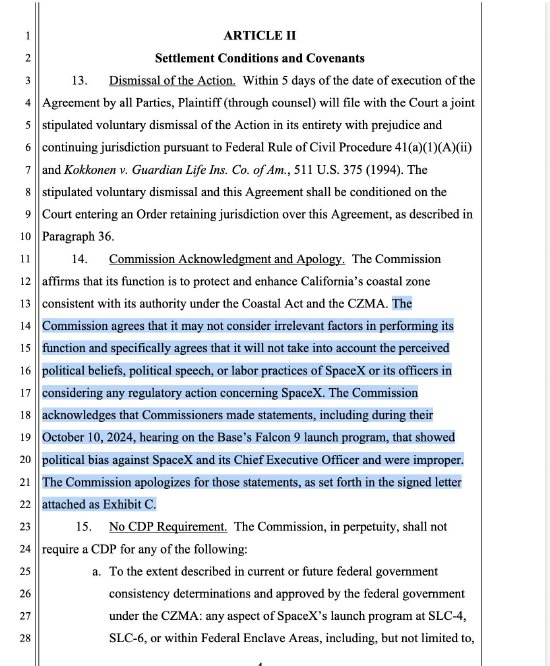 梅瑞特评论称:“这份文件意味着 SpaceX和加州海岸委员会已就其联邦诉讼达成和解,并为SpaceX未来的猎鹰9号火箭发射提供了长期的监管清晰度。”