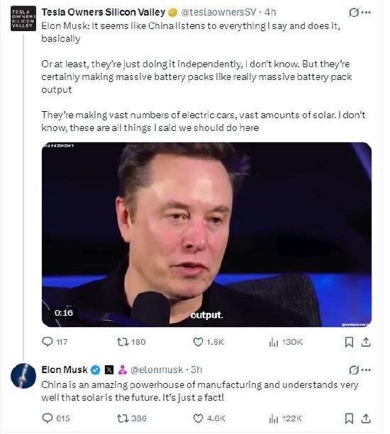 马斯克在这条帖子下回应称:“中国是令人惊叹的制造业强国,并且非常清楚太阳能是未来发展方向。这是不争的事实!”