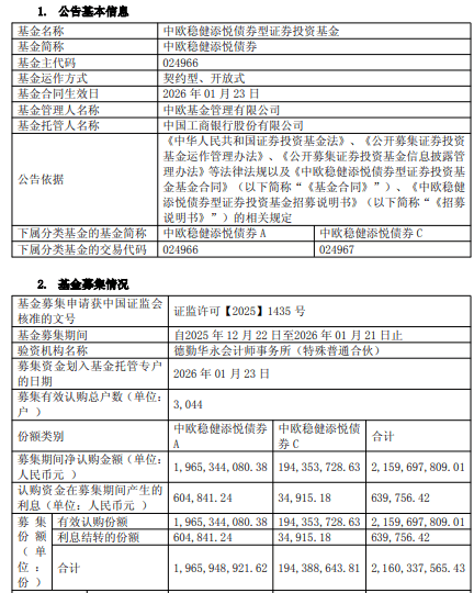 中国经济网北京1月26日讯 近日,中欧基金发布中欧稳健添悦债券型证券投资基金基金合同生效公告。