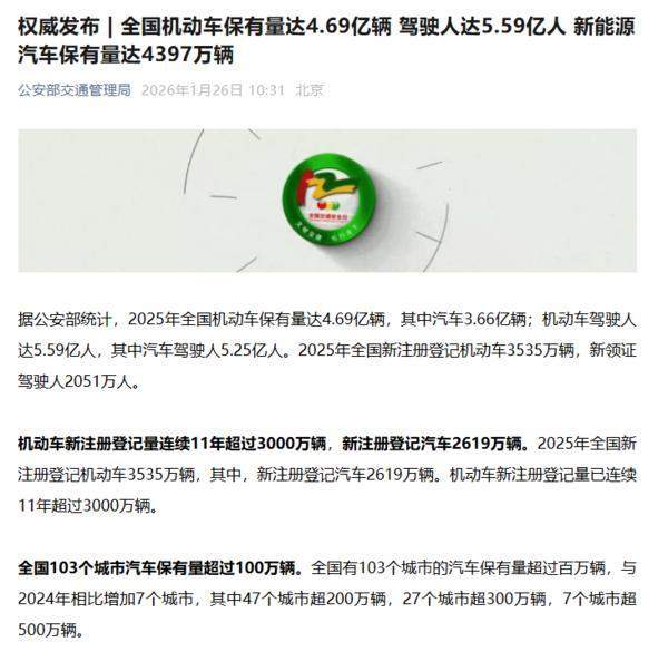 中国网财经1月26日讯 公安部交通管理局微信公众号发布的消息显示,据公安部统计,2025年全国机动车保有量达4.69亿辆,其中汽车3.66亿辆;机动车驾驶人达5.59亿人,其中汽车驾驶人5.25亿人。2025年全国新注册登记机动车3535万辆,新领证驾驶人2051万人。