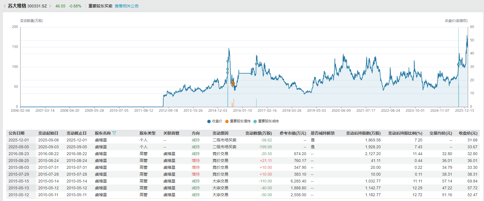 而据Wind统计,公司上市之后,虞樟星有进行了多次增减持动作。