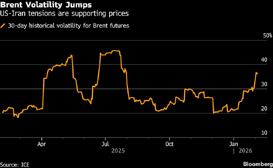 全球约三分之一原油产自中东,市场对该地区可能爆发冲突的担忧,推动油价上月走高,尽管当时已有供应过剩加剧的迹象。同时,油价也受到大宗商品市场整体动荡的波及,此前黄金、白银价格大幅暴跌,后续才收复部分失地。