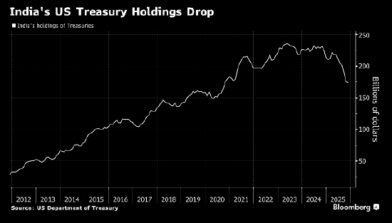 根据1月份美国 *** 公布的数据,由于印度央行支撑走弱的卢比,截至11月份,印度持有的美国长期债券已降至1,740亿美元的五年来低点,较2023年峰值下降26%。