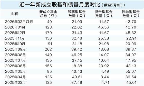 进入2026年,债基发行规模进一步下降,权益类基金的主导地位更加稳固。例如,在1月份,股票型基金发行50只,发行规模为264.75亿元,占比22.02%;混合型基金发行45只,发行规模为547.68亿元,占比45.56%。权益类基金合计发行占比高达67.58%,债基占比仅12.70%。2026年2月前六天的数据显示,权益类基金占比已接近40%。