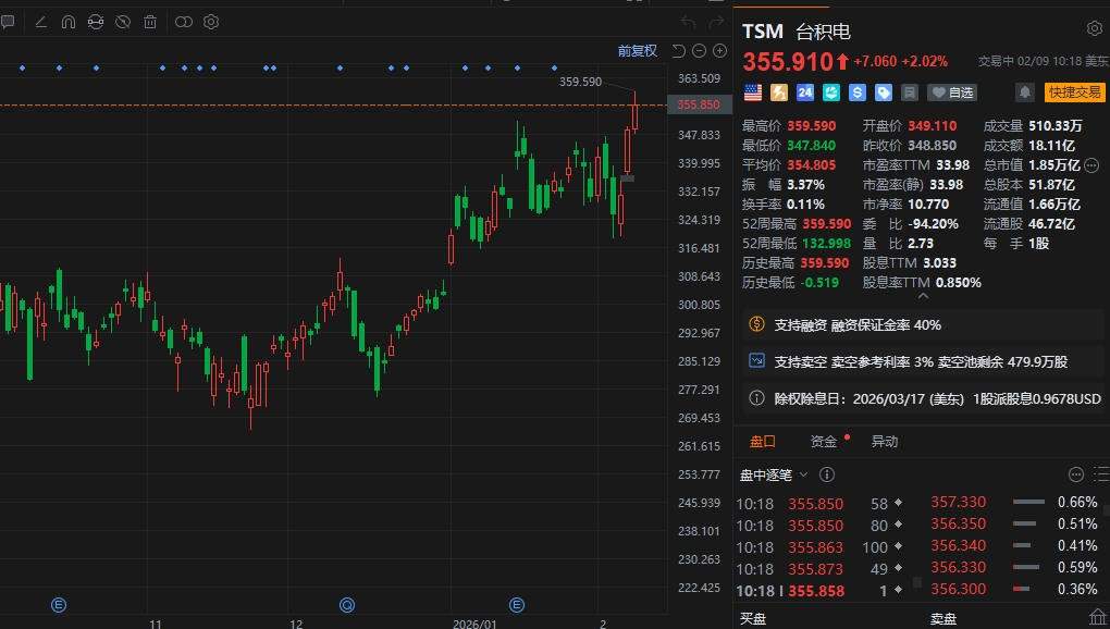入选了2026年格隆汇“全球视野”十大核心资产名单的台积电(T *** .US)盘中涨至3%,报359.59美元创历史新高,市值超1.85万亿美元。