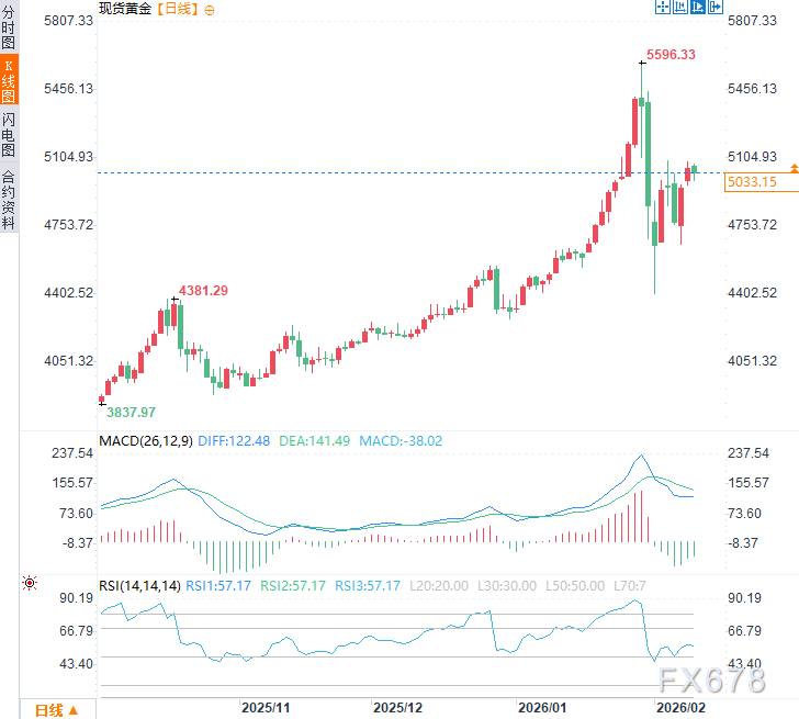 周一,黄金价格已回升至每盎司5000美元上方,周二亚欧时段现货黄金震荡下行,但仍运行于5000美元上方,现交投于每盎司5030美元附近,日内跌幅约0.6%。