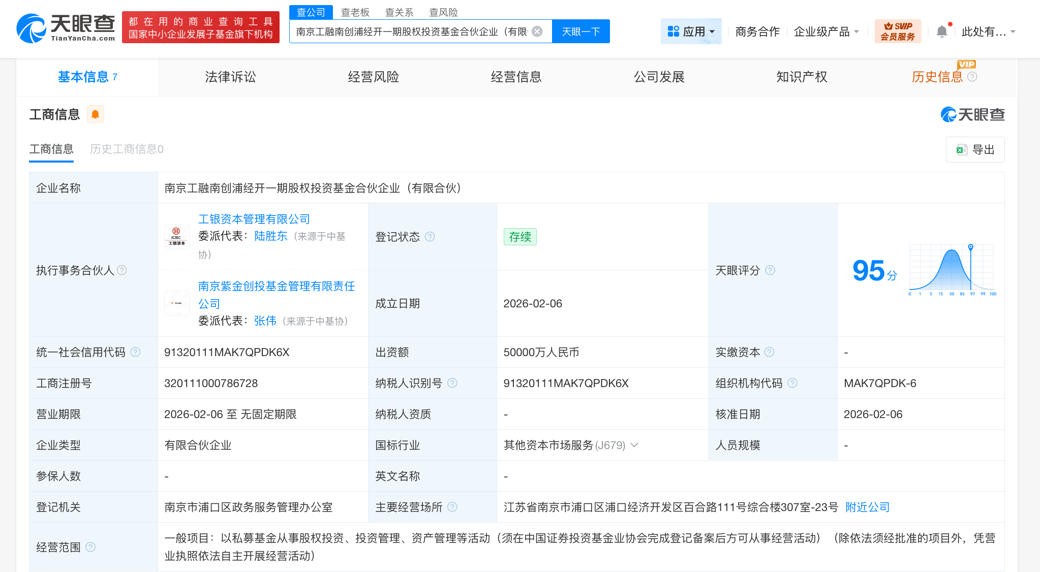 天眼查App显示,近日,南京工融南创浦经开一期股权投资基金合伙企业(有限合伙)成立,执行事务合伙人为工银资本管理有限公司、南京紫金创投基金管理有限责任公司,出资额5亿人民币,经营范围为以私募基金从事股权投资、投资管理、资产管理等活动。合伙人信息显示,该基金由工银金融资产投资有限公司、南京浦口开发区高科技投资有限公司、工银资本管理有限公司、南京浦口高质量发展投资基金合伙企业(有限合伙)等共同出资。