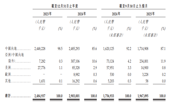 市场布局与客户结构带来的经营风险同样突出。惟远能源虽宣称因业务扩张和全球战略布局转向港股上市,但公司收入仍高度依赖内地市场,2025年前三季度中国内地收入17.1亿元,占总营收的87.1%,海外市场收入占比仅12.9%,全球化布局进展缓慢,未能形成多元化的收入结构,若内地数字能源行业政策调整、市场需求萎缩,公司营收将直接受到冲击。