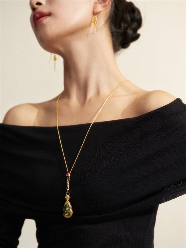 “沉璧-慧光葫芦吊坠”将传统吉祥文化与天然宝石的质感完美融合,成为此次珠宝中的“情感担当”。吊坠以中国传统葫芦造型为核心,谐音“福禄”,承载着古人对福气绵延、禄运亨通的美好祈愿。材质上甄选色泽纯净、质感温润的蓝珀――素有“琥珀之王”之称,在不同光线下折射出灵动的蓝色光晕,兼具装饰美感与情感寄托,自戴、赠友,皆是春日里极具意义的选择。