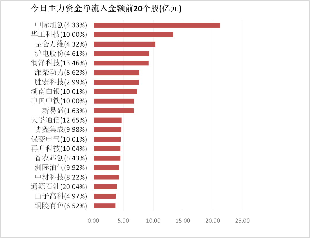 4.中际旭创(300308)主力资金净流入21.2亿元居首