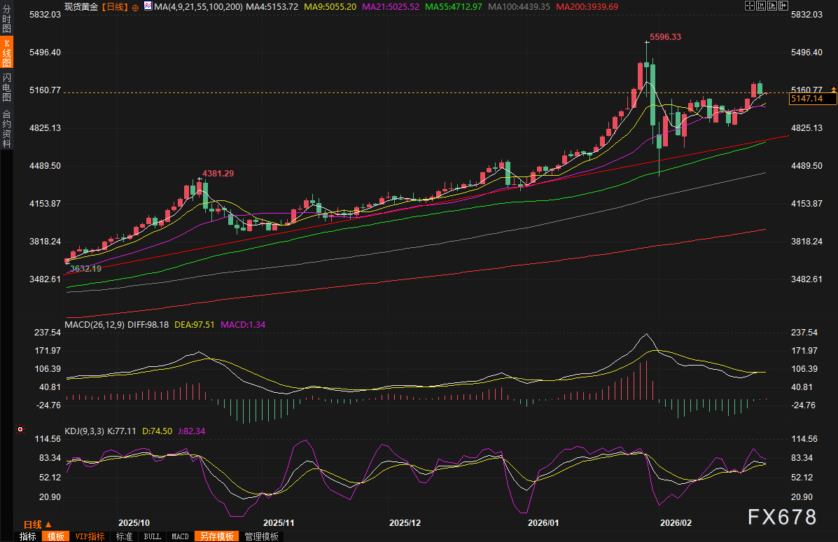 汇通财经APP讯――周三(2月26日)亚市早盘,现货黄金窄幅震荡,目前交投于5150美元/盎司附近。周二(2月24日)现货黄金价格出现显著回调,一度下跌近2.5%至接近5094美元,收报5141.43美元/盎司,跌幅约1.65%,从而中断了此前连续四个交易日的上涨行情。这一轮调整主要源于市场获利了结行为叠加美元指数的明显走强,导致以美元计价的贵金属承压下行。周二金价在触及近三周高点后转跌,回吐了周一的大部分涨幅,日K线形成“吞没”看空信号,显示短期多头动能有所减弱。尽管价格出现回落,但仍有逢低买盘提供支撑,交易参与者高度关注即将于稍后(北京时间周三上午10:00)公布的美国总统唐纳德・特朗普国情咨文讲话内容。该讲话预计将涉及财政政策、贸易关税及国际关系等关键议题,或为市场提供进一步的方向指引。同时,美联储官员近期持续释放的鹰派信号继续支撑美元汇率,例如波士顿联储主席苏珊・柯林斯明确表示,鉴于劳动力市场数据改善且通胀风险犹存,利率将在较长一段时间内维持不变。这种货币政策预期进一步强化了美元的吸引力,对黄金构成直接压制。