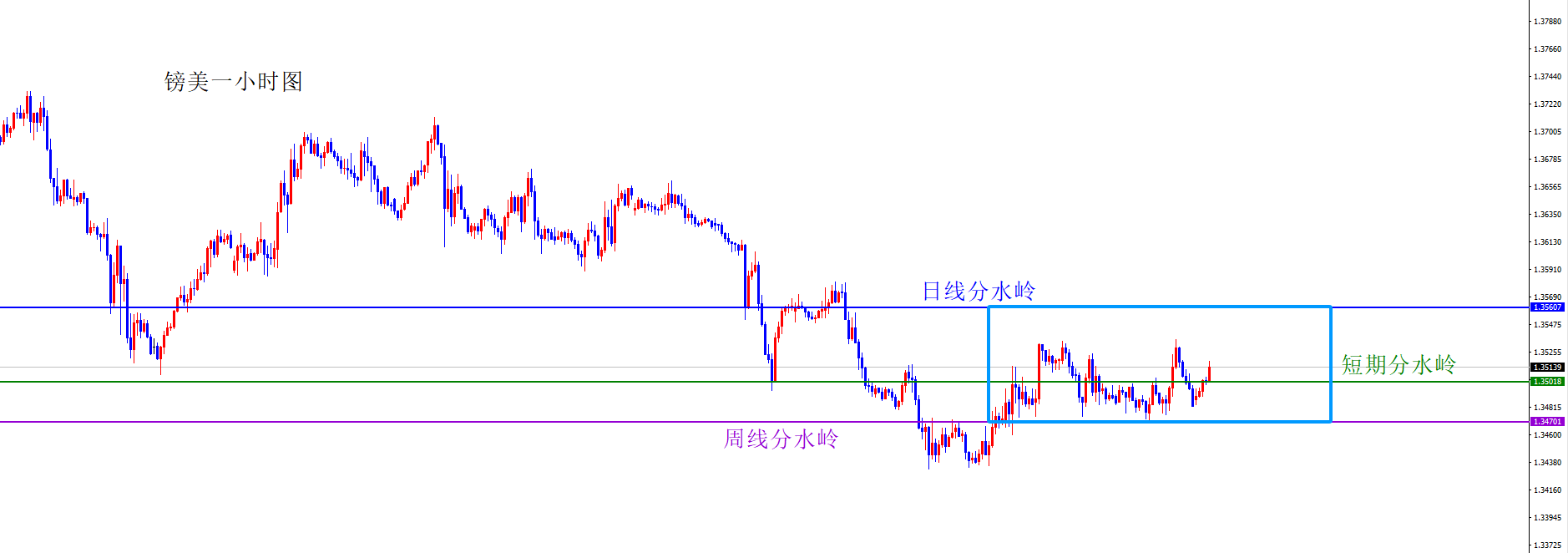 关键分水岭1.3500,短线偏向于1.3470-1.3560区间震荡,中间1.3500位置为震荡区间分水岭