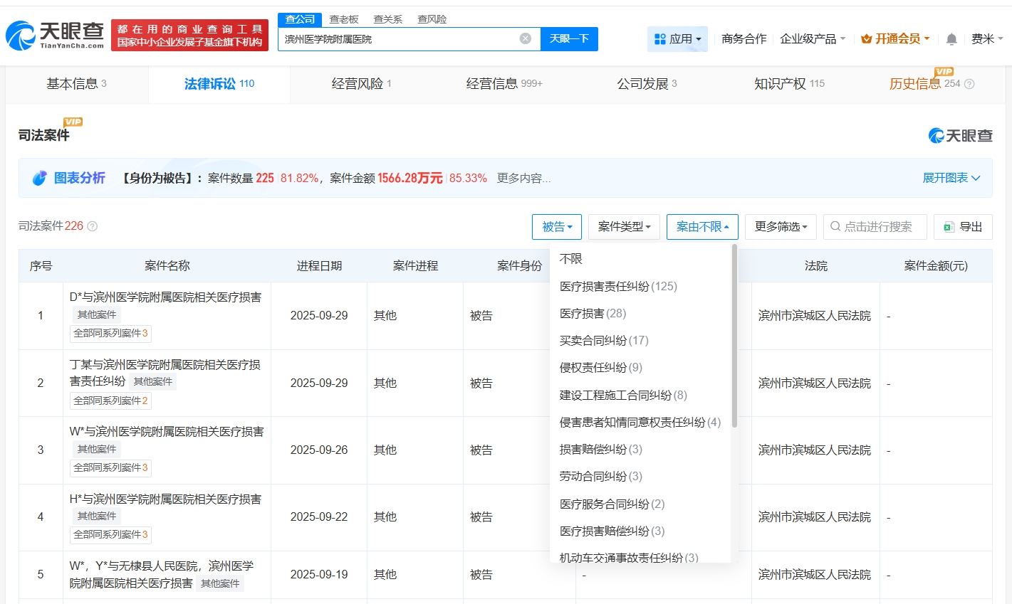 天眼查App显示,涉事医院滨州医学院附属医院法定代表人为王玉玖,开办资金约8.3亿人民币,宗旨和业务范围为面向社会提供医疗、预防、保健、康复服务,开展临床教学和医疗科研,培养卫生专业人才,法律诉讼信息显示,该医院曾因医疗损害责任纠纷、医疗损害赔偿纠纷、医疗服务合同纠纷等被起诉。历史信息显示,该医院曾存在被执行人、失信被执行人(老赖)信息。