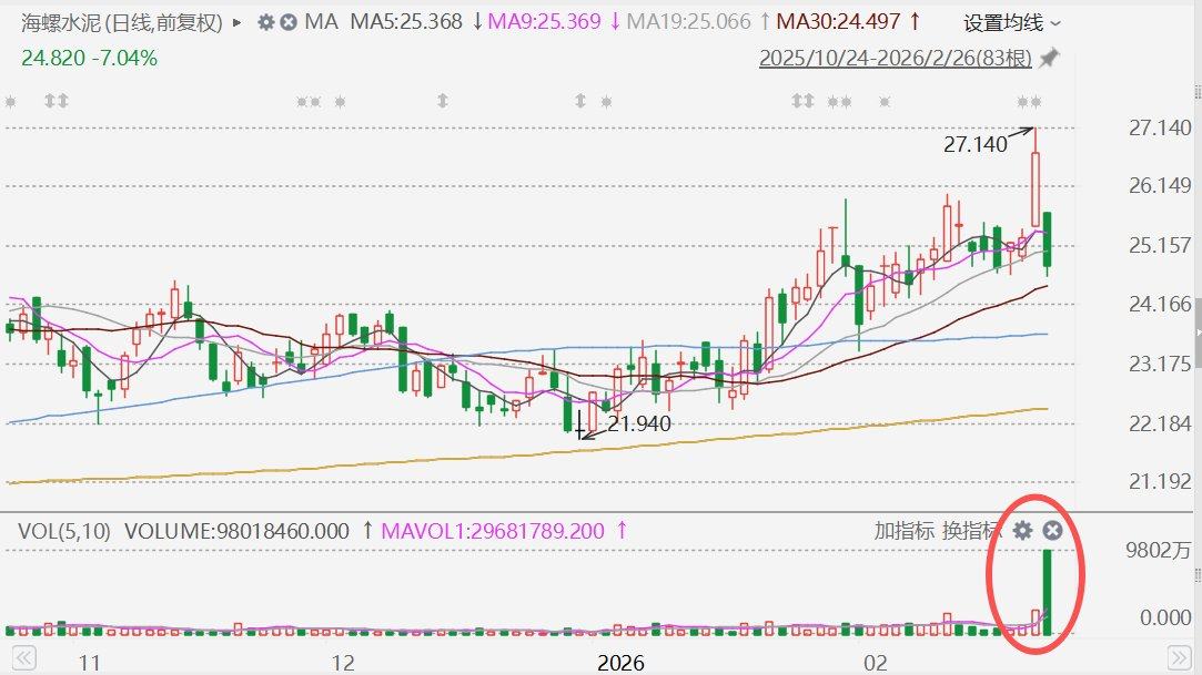 海螺水泥(0914.HK)今日放量大跌,盘中一度跌超7%至24.66港元,截至目前成交额放大至25亿港元。据观察,该股今早有多宗大手上板,每股作价25.7港元,涉7687.5万股,涉资19.76亿港元。