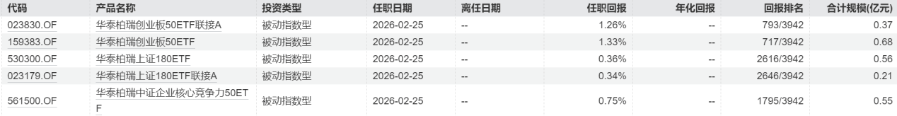 财闻注意到,从基金类型来看,柳叶青接手的5只产品均属于宽基指数产品。按照最新规模(场内基金截至2026年2月25日,场外基金截至2025年12月31日)计算,柳叶青接手的五只产品规模均不足1亿元。这五只基金的合计管理规模仅为2.37亿元。