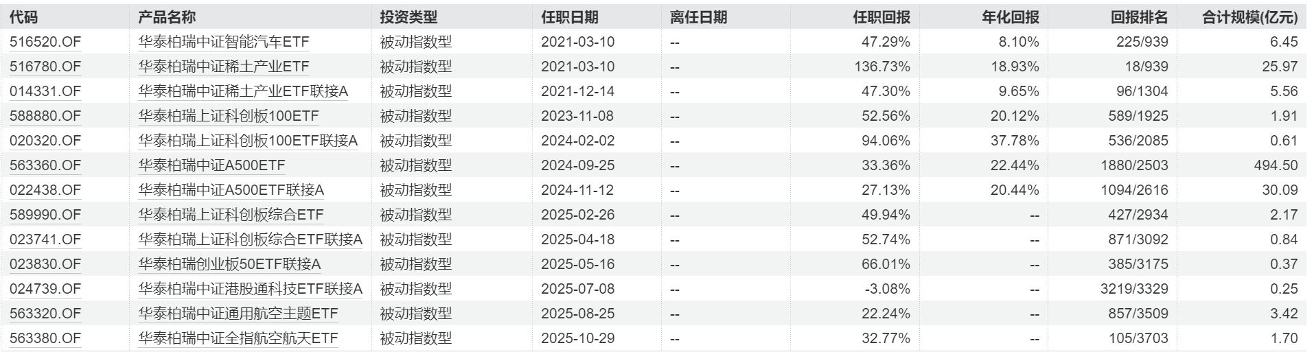 谭弘翔管理基金的调整路径与李茜相似。在卸任两只产品后,他仍保留13只在管基金,管理总规模为573.83亿元。其现有产品组合兼顾宽基与行业指数,包括A500ETF华泰柏瑞、科创100ETF华泰柏瑞、智能驾驶ETF、通用航空ETF等。