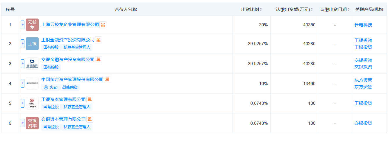 合伙人信息显示,该企业由上海云鲛龙企业管理有限公司、工银金融资产投资有限公司、交银金融资产投资有限公司、中国东方资产管理股份有限公司、工银资本管理有限公司、交银资本管理有限公司共同持股。其中,工银投资、交银投资出资比例均为29.9257%。