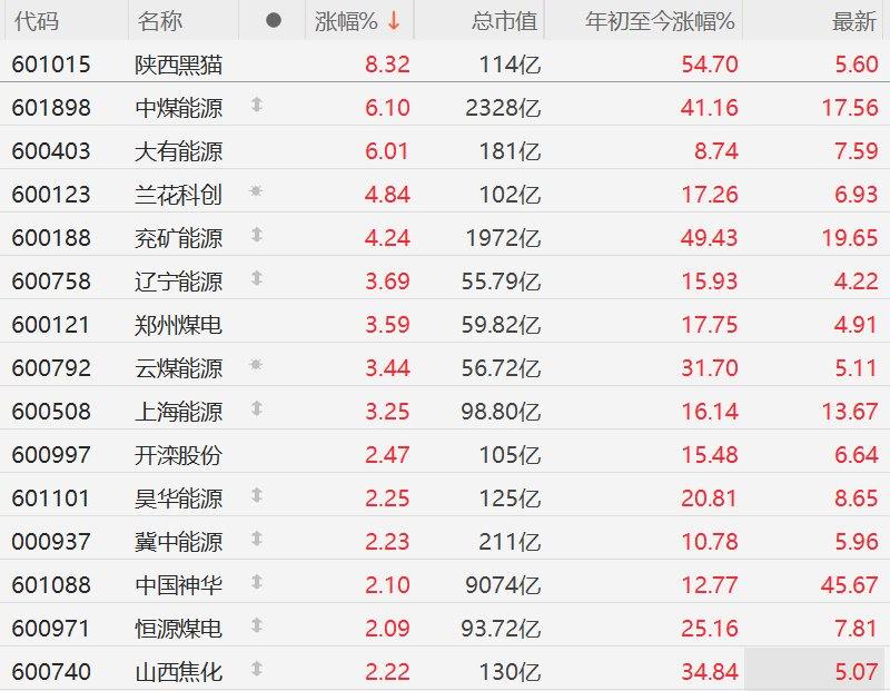 延续昨日涨势,A股煤炭股今日继续上涨,其中,陕西黑猫涨超8%,中煤能源、大有能源涨超6%,兰花科创、兖矿能源涨超4%,辽宁能源、郑州煤电、云煤能源、上海能源涨超3%。