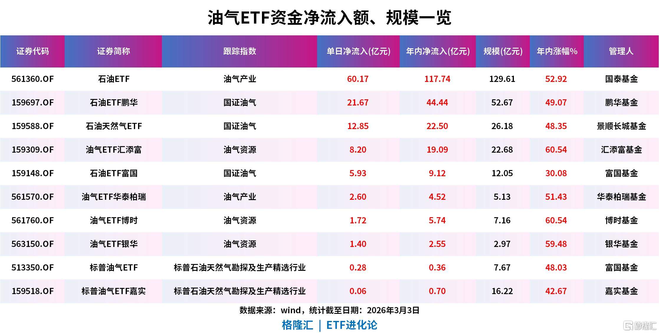 资金借道ETF买入油气。3月3日,超110亿资金净流入油气ETF,其中,石油ETF(561360)单日资金流入60.17亿元,最新规模129.61亿元;石油ETF鹏华(159697)单日资金流入21.67亿元,最新规模52.67亿元;石油天然气ETF(159588)单日资金流入12.85亿元,最新规模26.18亿元。