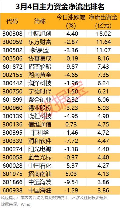 光模块龙头股中际旭创(300308)主力资金净流出18.02亿元,居首;东方财富(300059)和新易盛(300502)主力资金净流出均超11亿元;热门股招商轮船(601872)跌近10%,主力资金净流出7.43亿元。