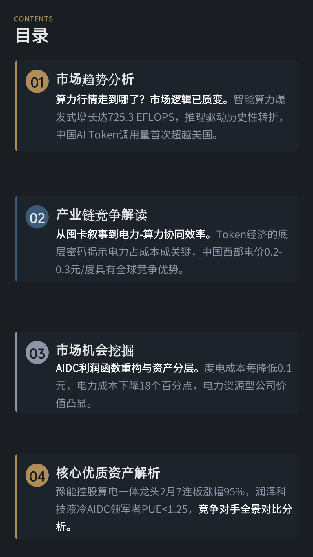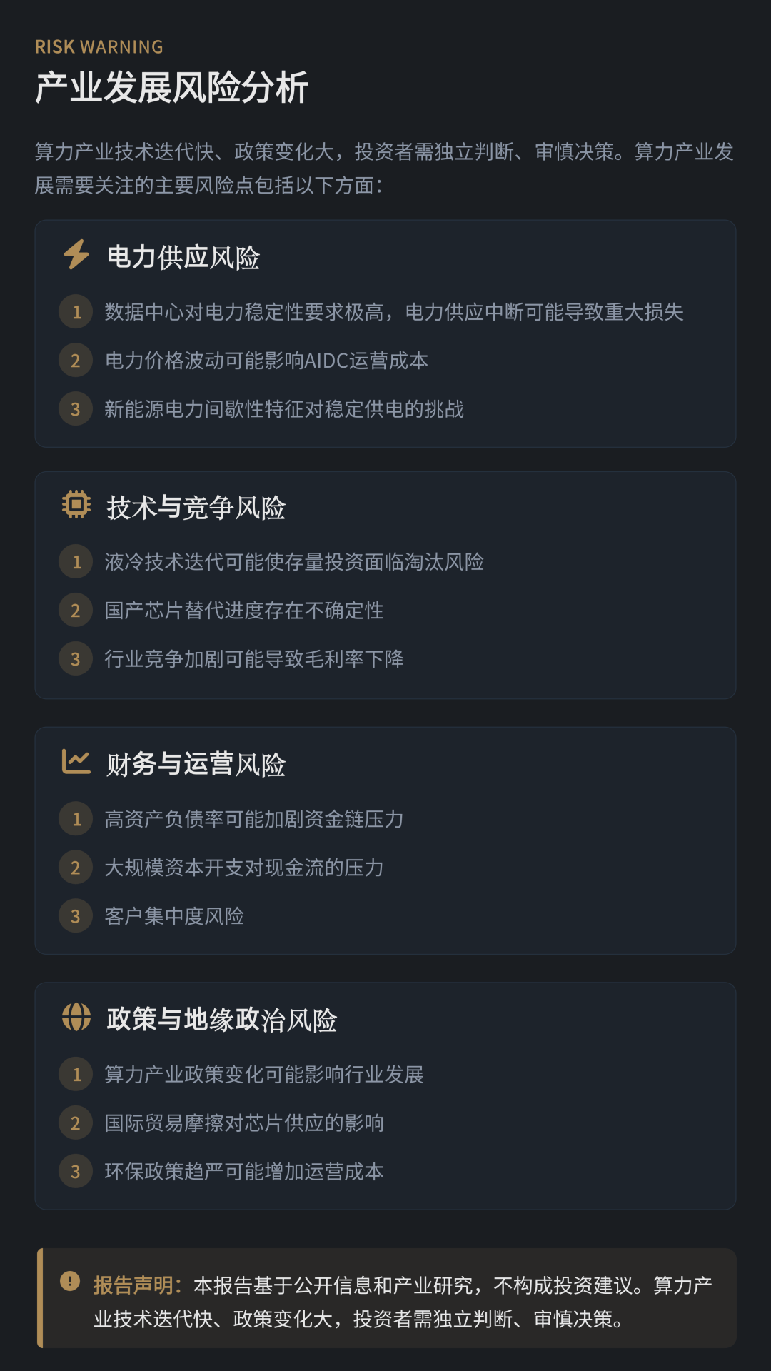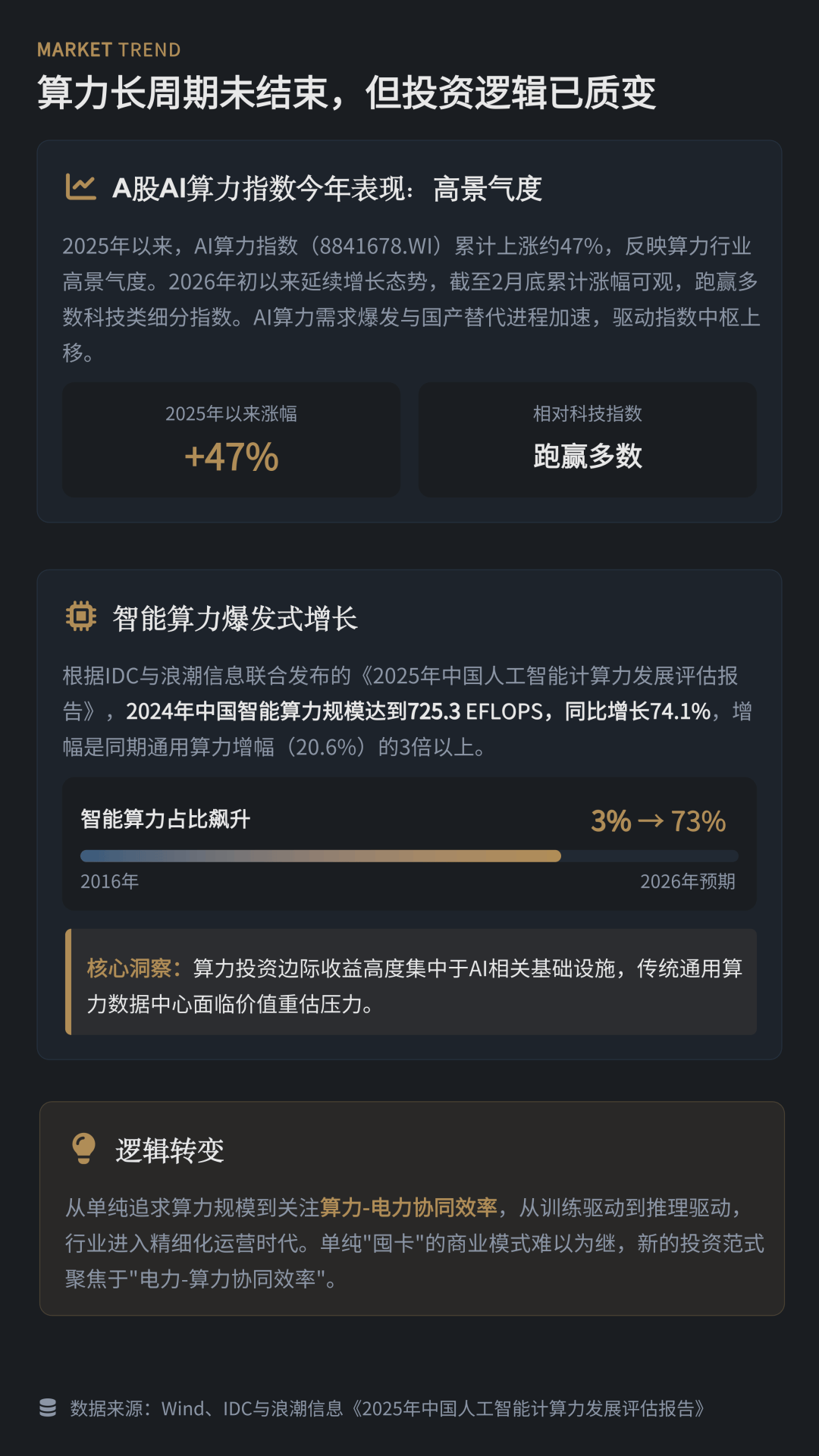 总体来看,在两会政策推动与AI应用需求增长的共同作用下,算力产业仍处于长期发展周期之中。但报告同时指出,未来行业竞争的关键已不再是单纯扩张算力规模,而是电力资源、能效水平和运营效率的综合竞争。对于市场而言,算力牛市正在进入“下半场”,产业价值也在向真正具备成本优势与现金流能力的企业集中。
