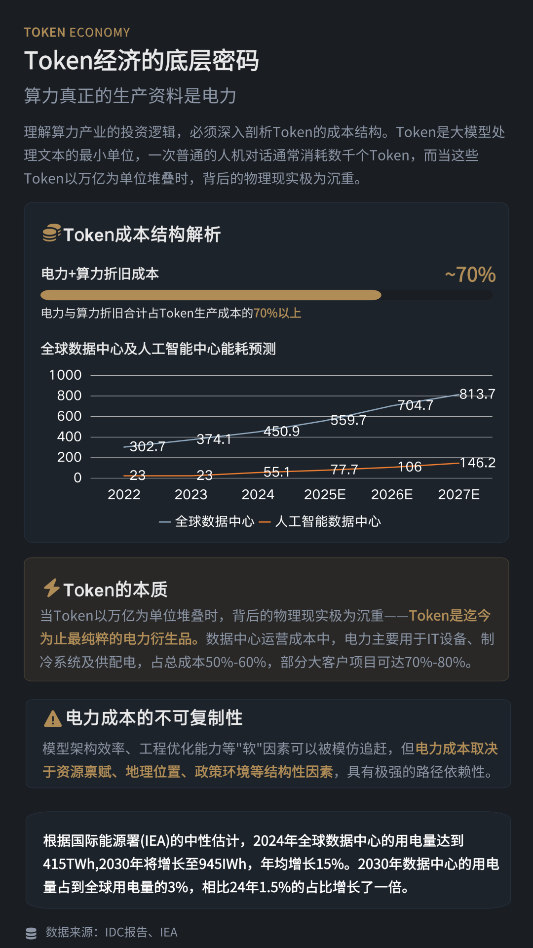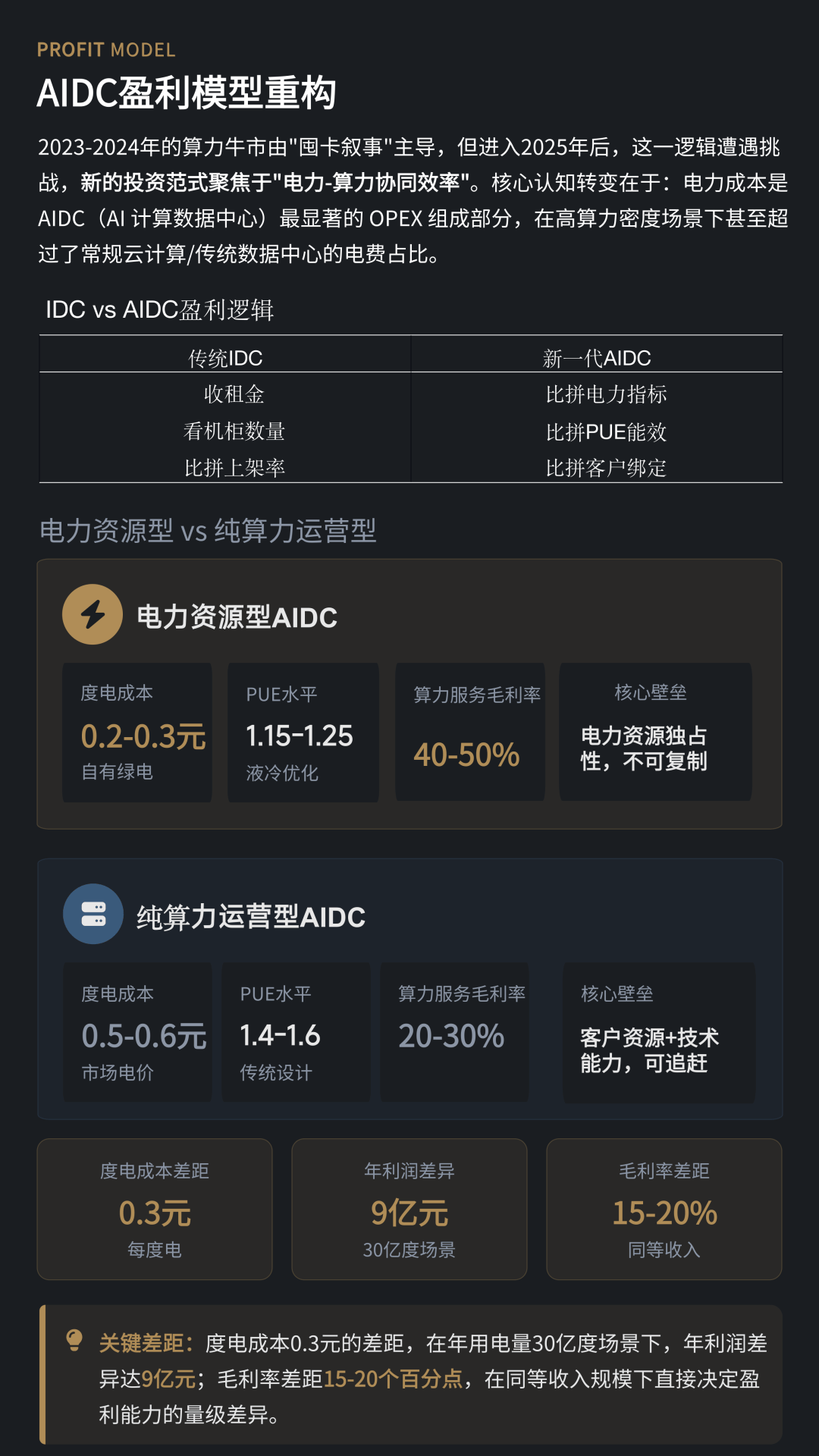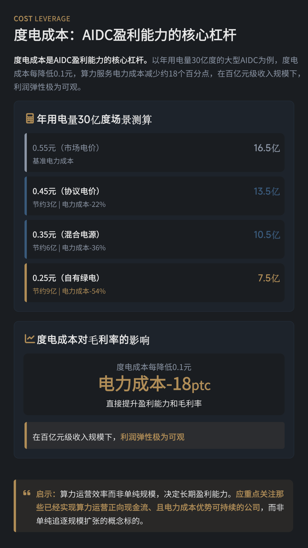 与此同时,算力产业的成本结构也在重塑。研究显示,在数据中心(AIDC)的运营成本中,电力及算力折旧成本合计占比可达70%左右。报告指出,当算力需求规模进入万亿级Token时代,电力已经成为算力产业最关键的生产要素。以年用电量30亿度的大型AIDC为例,度电成本每降低0.1元,就可能带来数亿元级别的利润差异,电力成本正在成为算力企业盈利能力的核心杠杆。