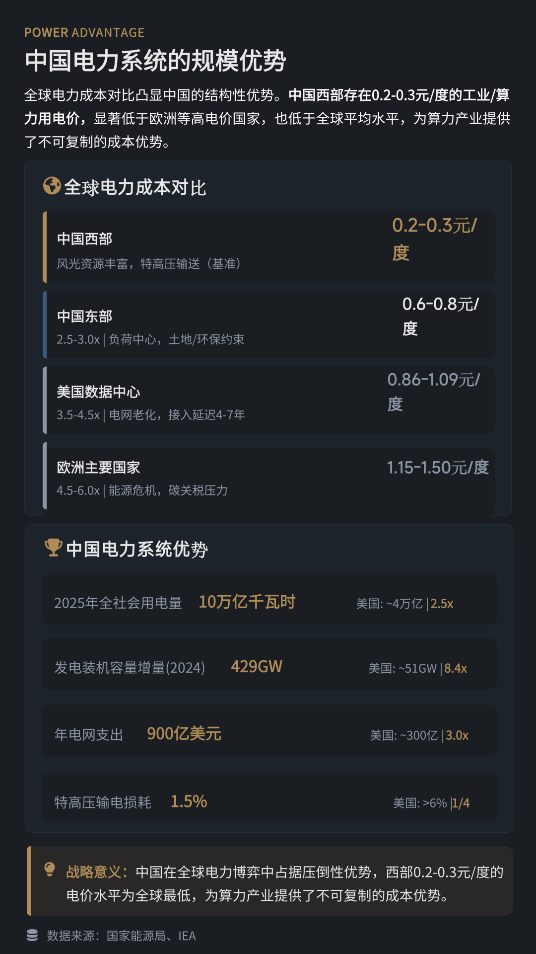 在这一背景下,中国电力体系的规模优势被认为是重要产业支撑。研究显示,中国西部部分地区工业电价可低至0.2―0.3元/度,显著低于欧美主要国家,为算力产业提供了较为突出的成本优势。算力产业与能源体系深度协同,也成为“算电协同”基础设施建设的重要现实基础。