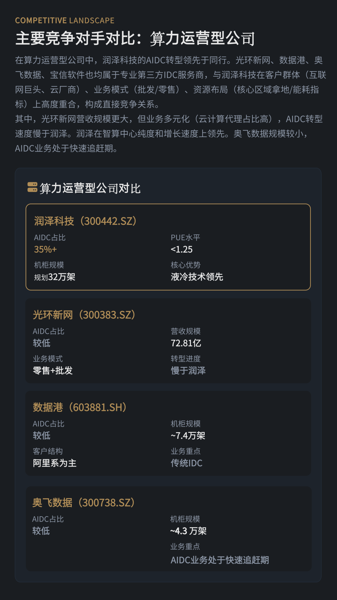基于产业链演进,报告提出A股算力资产的“四层分化”框架,包括电力资源型企业、算力运营型企业、设备配套型企业以及概念映射型企业,并提示市场应更加关注具备稳定电力资源、运营效率和正向现金流能力的核心资产。例如电力资源与算力协同布局的豫能控股(001896),以及以液冷智算中心为代表的算力运营商润泽科技,均是当前产业转型的重要样本。