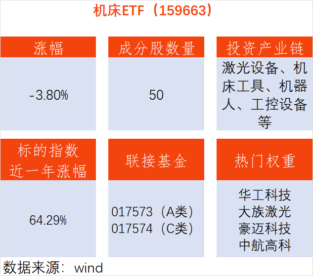 机床ETF(159663),紧密跟踪的中证机床指数,涵盖了我国制造业产业链中的关键一环――高端装备制造领域,涉及激光设备、机床工具、机器人、工控设备等行业,是新质生产力理念强调创新驱动与产业升级落地实践的核心阵地。其场外联接基金为,A类:017573;C类:017574。