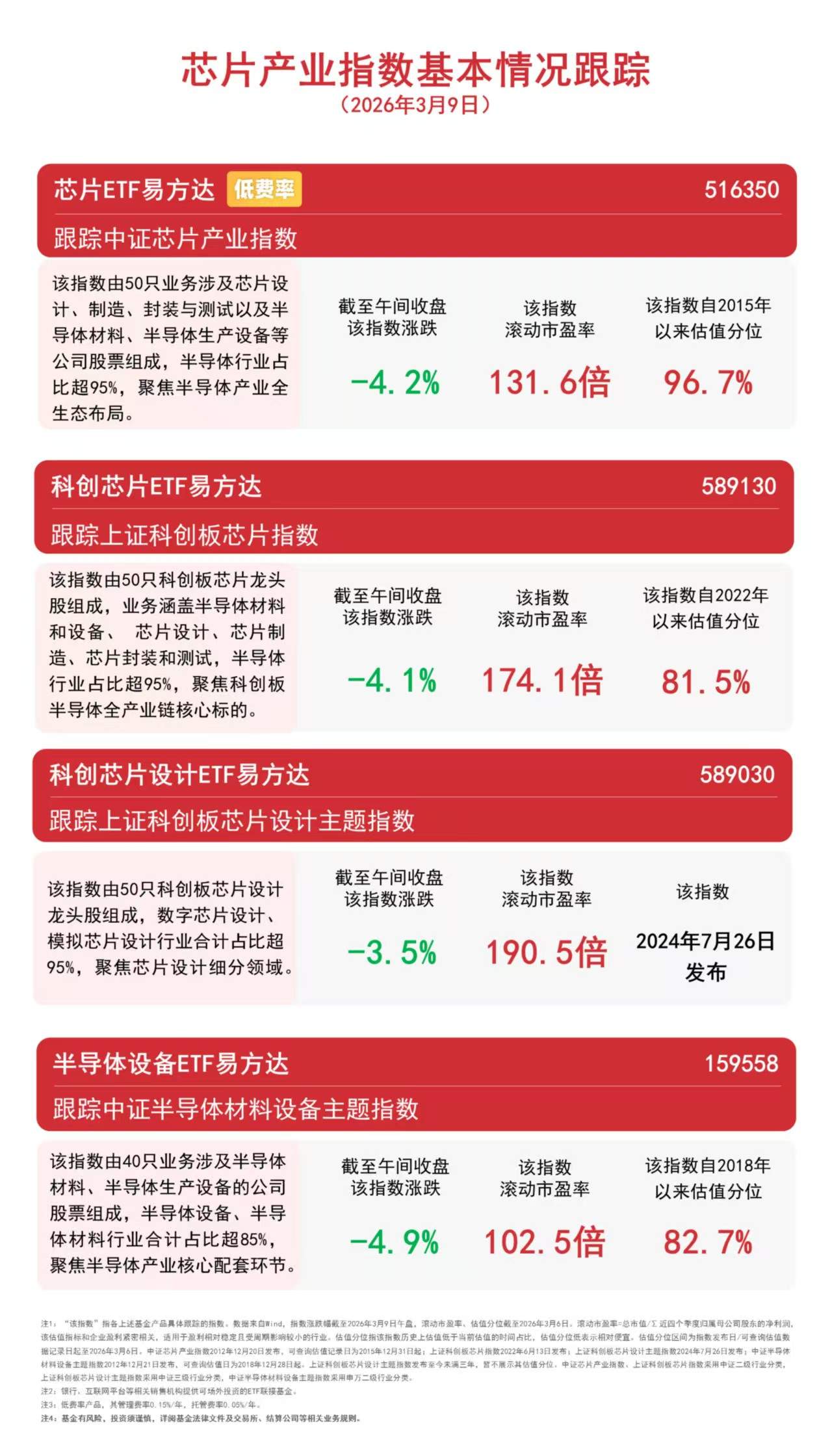 3月9日早盘,芯片产业链集体下挫。截至午间收盘,上证科创板芯片设计主题指数下跌3.5%,上证科创板芯片指数下跌4.1%,中证芯片产业指数下跌4.2%,中证半导体材料设备主题指数下跌4.9%,资金逆势布局,半导体设备ETF易方达(159558)半日净申购达3200万份。