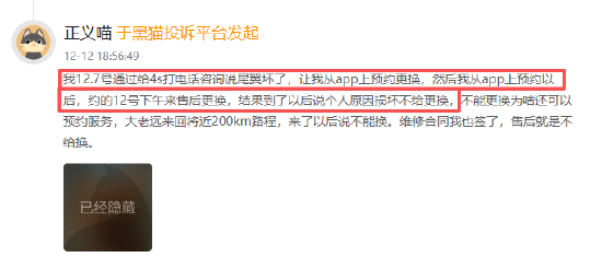 本年度,有消费者反映,12月7号其通过给4s店打 *** 咨询得知尾翼坏了,被告知可从app上预约更换,随后该消费者从app上预约了12号下午前往售后更换,结果到店后却被告知因个人原因损坏不给更换。该消费者质疑,不能更换为何还能预约服务,自己大老远来回将近200km路程,到店后却得到这样的答复。且维修合同都已签了,售后仍拒绝更换。特斯拉累计收到投诉1782件,回复率近60.33%。