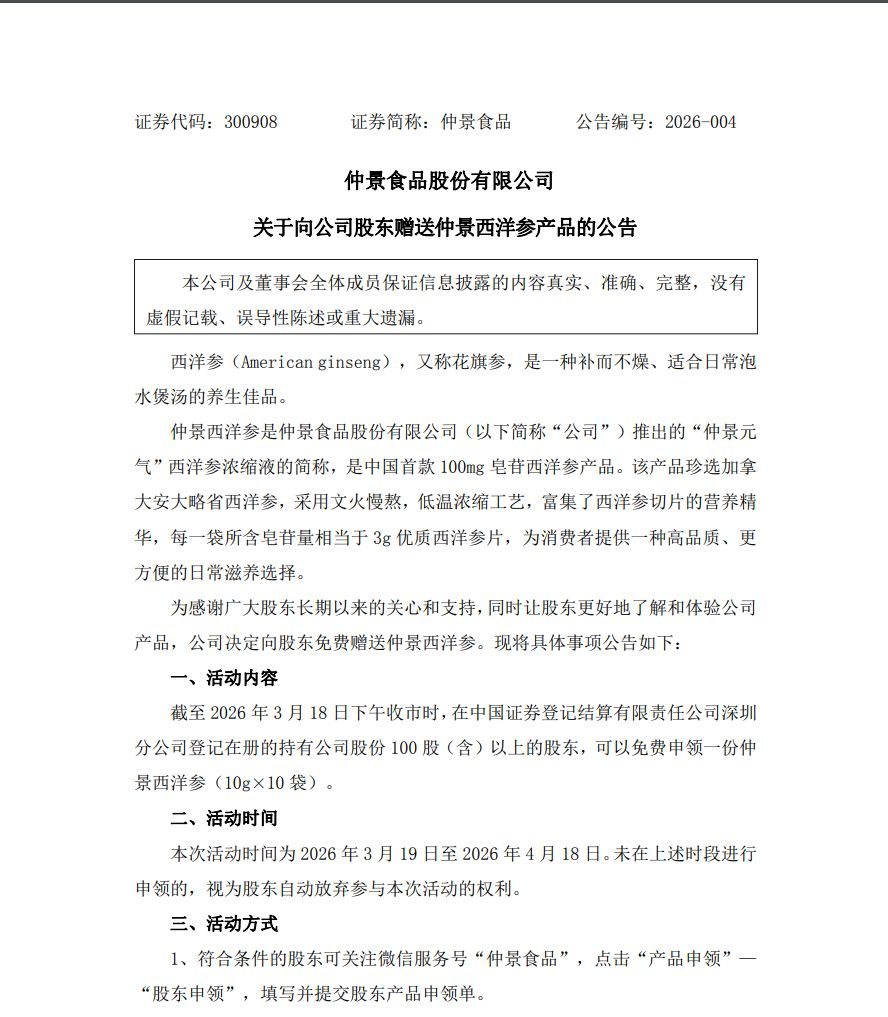3月9日,仲景食品发布关于向公司股东赠送仲景西洋参产品的公告。公告显示,为感谢广大股东对公司的关心和支持,同时为使股东更好地了解公司产品,公司决定向全体股东免费赠送一份产品。本次的具体产品规格为“仲景西洋参”(10克×10袋)。
