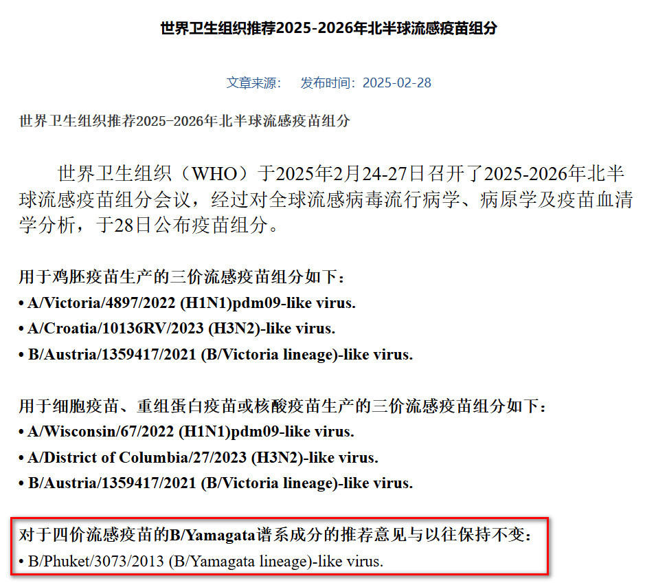 实际上,在去年11月中国疾控中心发布的《中国流感疫苗预防接种技术指南(2025―2026)》里,也提到了B/Yamagata系毒株已多年无全球自然流行,以及WHO认为将其纳入四价流感疫苗组分并非必要的态度。