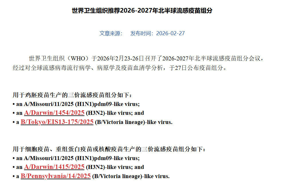2月27日,世界卫生组织(WHO)正式发布了《2026―2027年北半球流感季节流感疫苗推荐成分》报告。与往年不同,今年的报告只推荐了三价疫苗的成分,四价疫苗的成分推荐被取消,这意味着能覆盖多一种毒株的流感疫苗很有可能退出今年的市场。