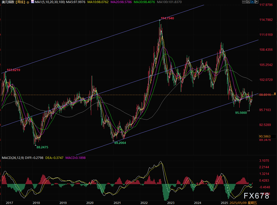 美元指数周线图显示,美元指数多次跌穿长期上升通道,目前勉强守住通道下轨。