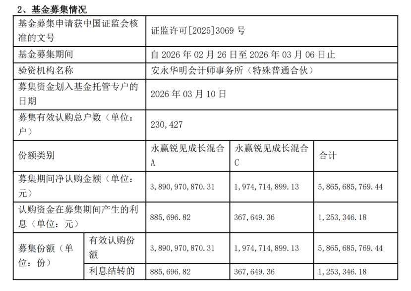 3月11日,永赢基金发布永赢锐见成长混合基金合同生效公告。公告显示,该产品募集期为2月26日至3月6日,募集期间净认购金额达58.67亿元,募集有效认购总户数超23万户。