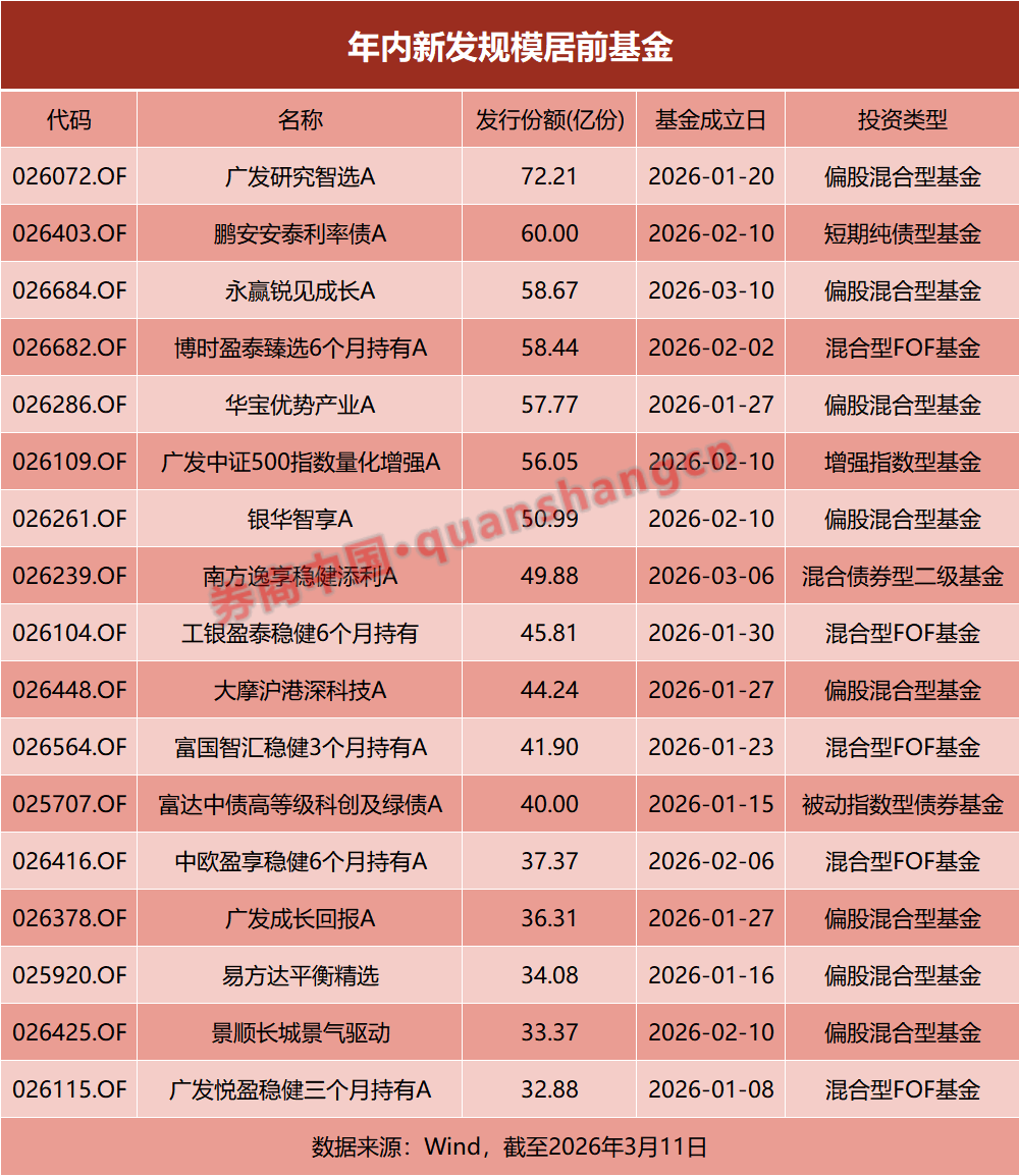 今年以来,新基金发行市场持续升温,“爆款”频现。Wind数据显示,以基金成立日为统计口径,截至3月11日,年内新成立的公募产品累计已达251只,合计募资规模突破2300亿元关口,达到2321.45亿元。其中,主动权益类基金的发行热度尤为突出,多只产品募资表现抢眼,广发研究智选以72.21亿元的募资规模暂居年内首位;永赢锐见成长混合以58.67亿元的规模紧随其后;此外,华宝优势产业混合、银华智享混合的发行规模分别为57.77亿元、50.99亿元,居于前列。