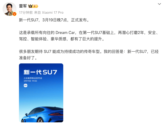 小米集团CEO雷军:新一代SU7 3月19日晚7点正式发布!还有Xiaomi Book Pro14,Xiaomi Watch S5 0561news 2026年03月16日 09:58 3 0 格隆汇3月16日|小米CEO雷军:新一代SU7 3月19日晚7点正式发布。另据小米汽车消息,小米春季新品发布会还有两款新品:全新高性能超轻薄本,Xiaomi Book Pro14;全能运动长续航手表,Xiaomi Watch S5。