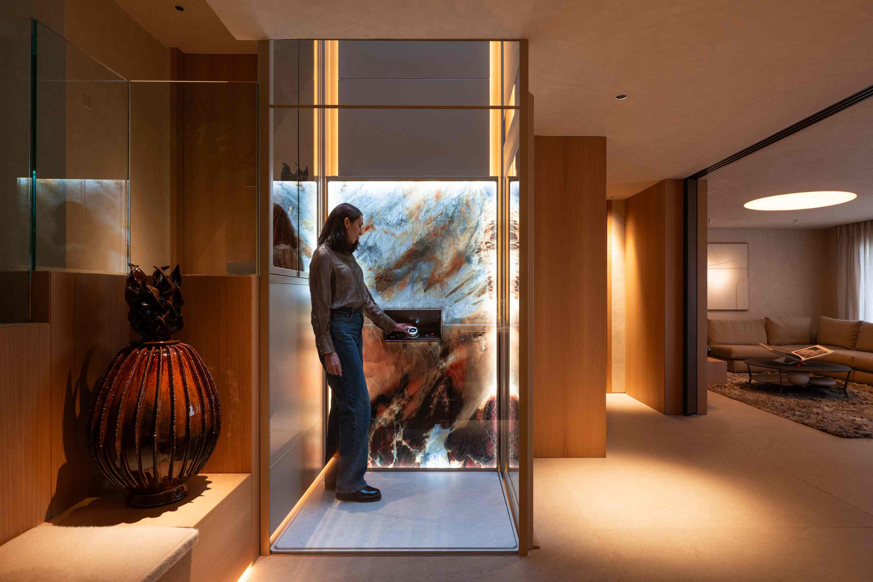 瑞特科的设计在于“隐形融合”与“个性表达”的平衡。最小预留尺寸仅870x910mm,0底坑设计无需破坏土建,老房加装也能灵活适配。斯堪的纳维亚艺术家设计的背景墙、冷暖可调的星空顶、瑞典Bolon品牌地毯等丰富定制选项,让每部电梯都成为彰显品味的空间焦点。针对中国市场,品牌特别丰富了契合中式风格的材质与美学选择,实现北欧简约与中式和谐的融合。
