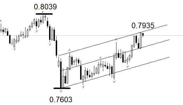 行情方面,USDCHF中短期走势偏多头,目前市价运行于图中上升通道内部,市价接近通道上轨,如果今日收阴线,短线遇阻回落概率较高。中期高点为0.8039,高于最新上涨波段的更高点0.7935点,阻力作用仍然有效。中期低点为0.7603,距离市价较远,参考意义不大。