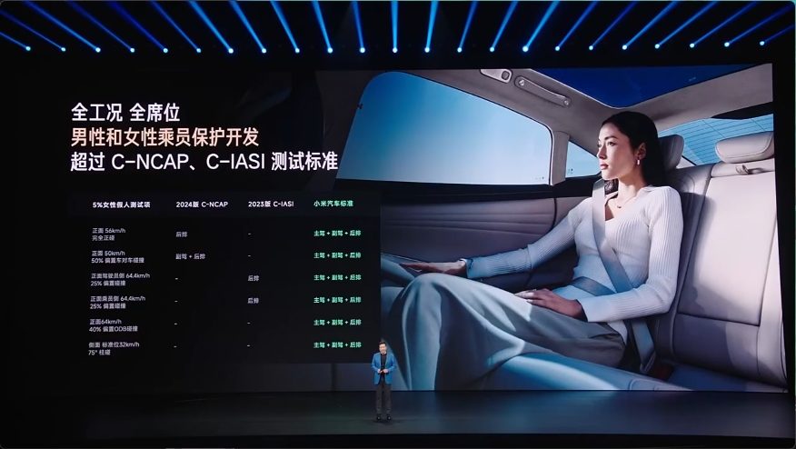 针对被动安全,新一代小米SU7在关键部位升级了2200兆帕超强钢。其内嵌式防滚架覆盖A柱至C柱区域。同时,全车四门防撞梁升级至2200兆帕规格,承载能力提升39%。车内防护方面,新车全系标配9个安全气囊,并新增后排双侧气囊。在测试执行上,小米同时采用男女假人进行全席位、全工况测试,并完成了时速60公里(相对时速120公里)的50%偏置正面碰撞极限测试,测试碰撞能量达到标准工况的1.44倍。